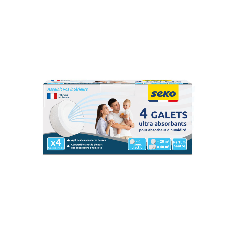 Les recharges pour absorbeur dhumidité, conditionnées en lot de 4 galets de 450 g, sont conçues pour prolonger lefficacité de l'absorbeur dhumidité. | Grâce à leur technologie de galet percé, elles offrent une absorption rapide de lhumidité ambiante, protégeant ainsi une pièce de 20 m² pendant environ 6 semaines. | Sans parfum ajouté, elles luttent efficacement contre la condensation, les moisissures et les odeurs de renfermé. | Leur format universel les rend compatibles avec la plupart des absorbeurs dhumidité disponibles sur le marché.