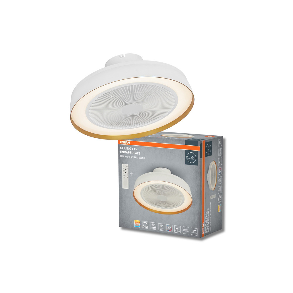 Ventilateur de plafond LED Compact qui combine lumière et ventilation. | Le ventilateur plafond Encapsulate 480 allie design moderne et fonctionnalité avancée pour un confort optimal dans les pièces de 13 à 20 m². | Avec un débit dair maximal de 1900 m³/h et 6 niveaux de vitesse, il permet de réguler la température et léclairage selon vos besoins. | La température de couleur réglable (27006500 K) et lintensité lumineuse ajustable (0100 %) offrent une ambiance personnalisable, idéale pour les salons, salles à manger ou chambres. | Son moteur DC silencieux et ses modes été/hiver en font un appareil polyvalent, adapté à toutes les saisons.