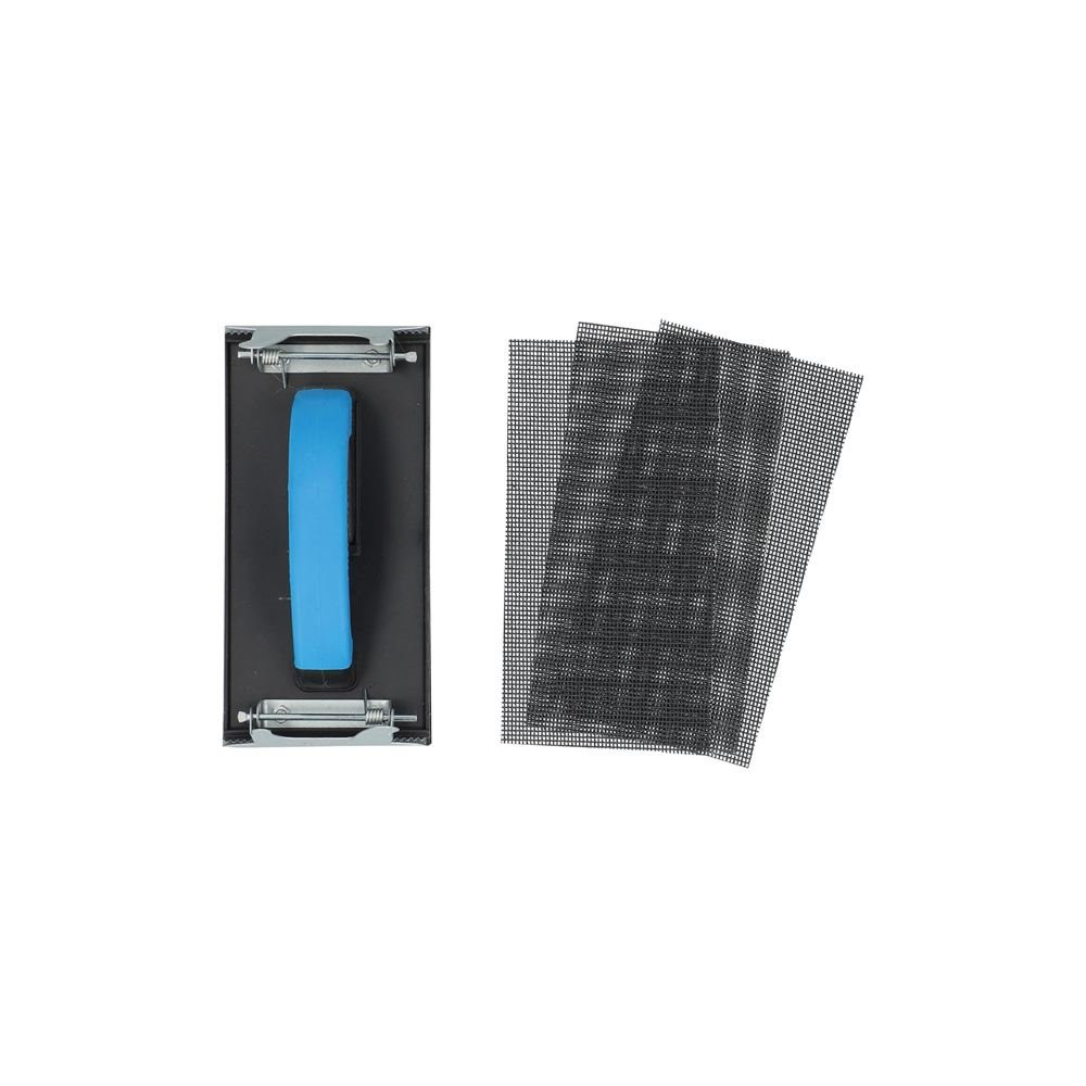 Le kit inclut 4 grilles abrasives de maille carbure : 2 en grain 120 pour l'égrisage et la mise à niveau des surfaces, et 2 en grain 220 pour la finition douce avant application d'une peinture ou d'un enduit de finition. La particularité des grilles maille est d'être utilisables des deux côtés, doublant ainsi leur durée de vie par rapport aux abrasifs classiques.