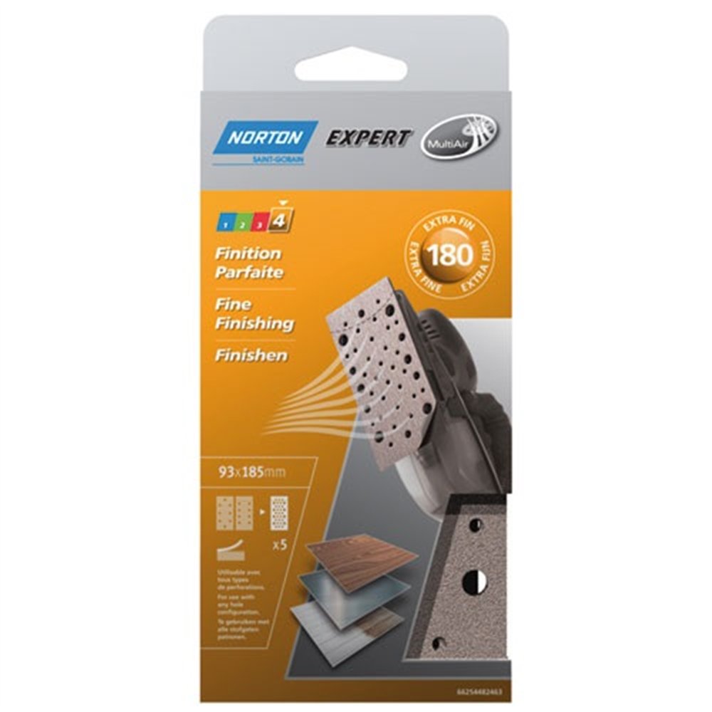 Le patin auto-agrippant garniture multi-air pour ponceuse vibrante grain de 180 finition parfaite longueur 185 millimètres largeur 93 millimètres en lot de 5 de chez Norton à la nouvelle perforation multi-air. Elle facilite le choix du produit ! Ces abrasifs peuvent être utilisés sur des ponceuses à perforations différentes. Ces patins existent pour chacune des 4 étapes de ponçage du décapage puissant à la finition parfaite, pour un résultat optimal. Le système multi-air c'est moins de poussière