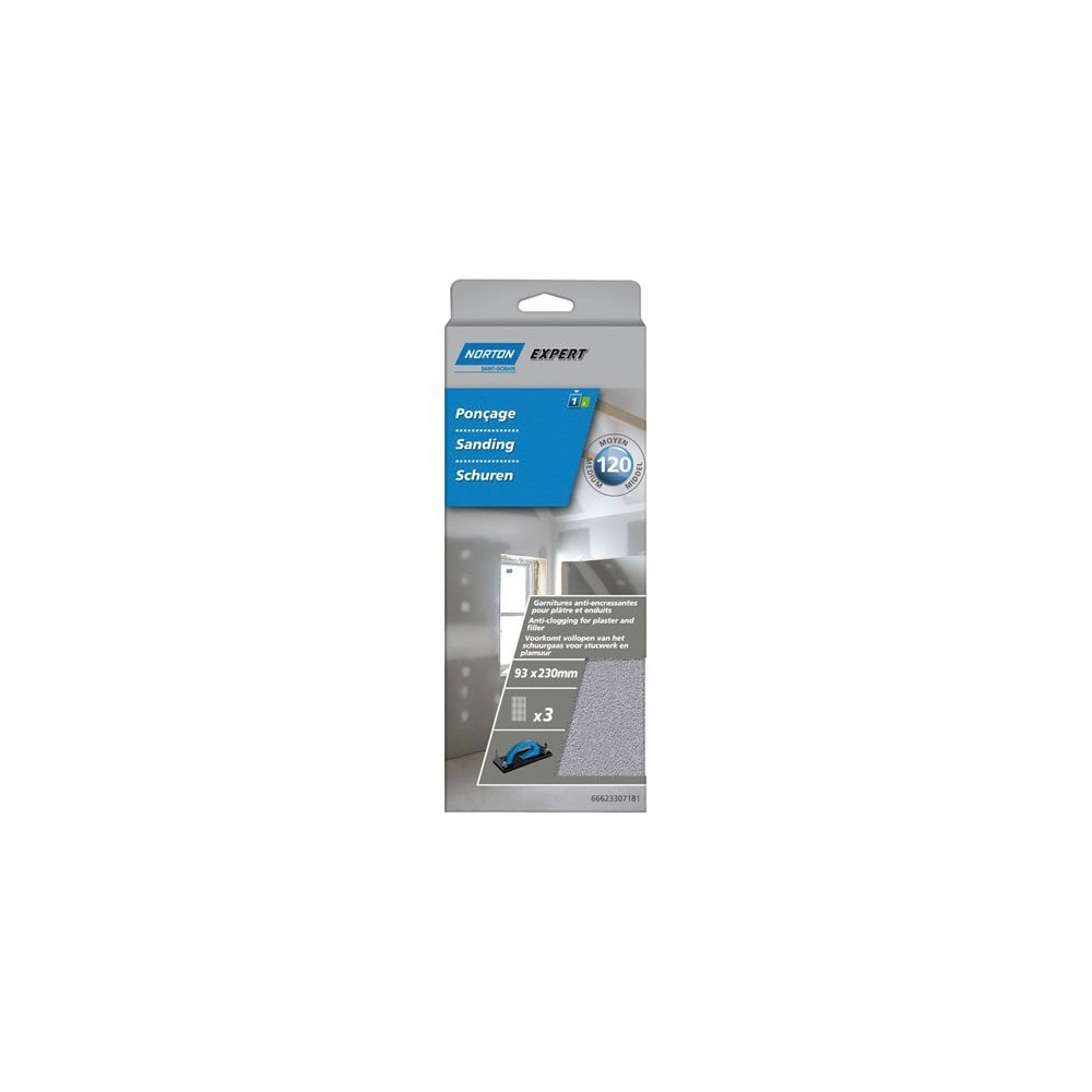 Les patins spécial plâtre Norton grain 120 représentent une solution abrasive innovante pour tous les travaux de ponçage de plâtre, enduits, bois et peinture. Conditionnés en lot de 3 garnitures au format 93 x 230 mm, ces patins à structure maille carbure se distinguent des papiers abrasifs traditionnels par leur conception ouverte qui élimine le colmatage en cours d'utilisation.