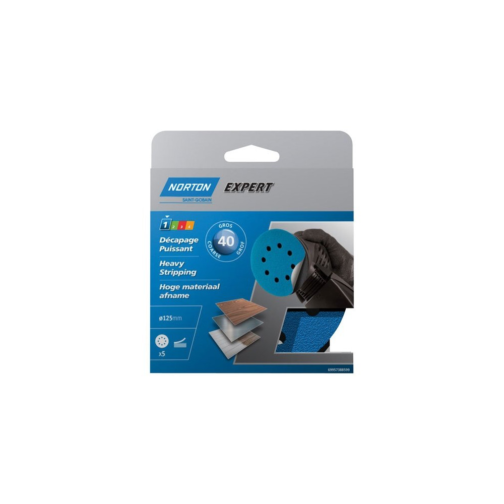 Attaquez les travaux de décapage les plus exigeants avec le disque abrasif auto-agrippant Norton Expert grain 40, diamètre 125 mm, vendu en blister de 5 disques. Ce grain très agressif est taillé pour les phases de décapage puissant : enlèvement de vieilles couches de peinture, ponçage d'ébauche sur bois brut ou arasage de matériaux récalcitrants.