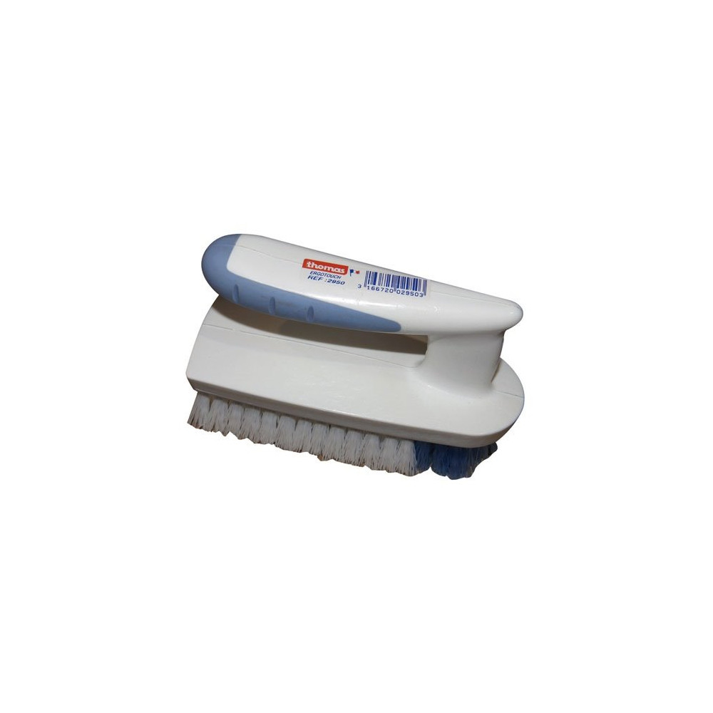 La brosse à main fer à repasser Ergotouch THOMAS repense l'accessoire de repassage avec une conception bi-matière alliant confort d'utilisation et efficacité technique. Sa poignée en polypropylène renforcée d'élastomère bleu épouse naturellement la paume pour réduire la fatigue lors des sessions de repassage prolongées.