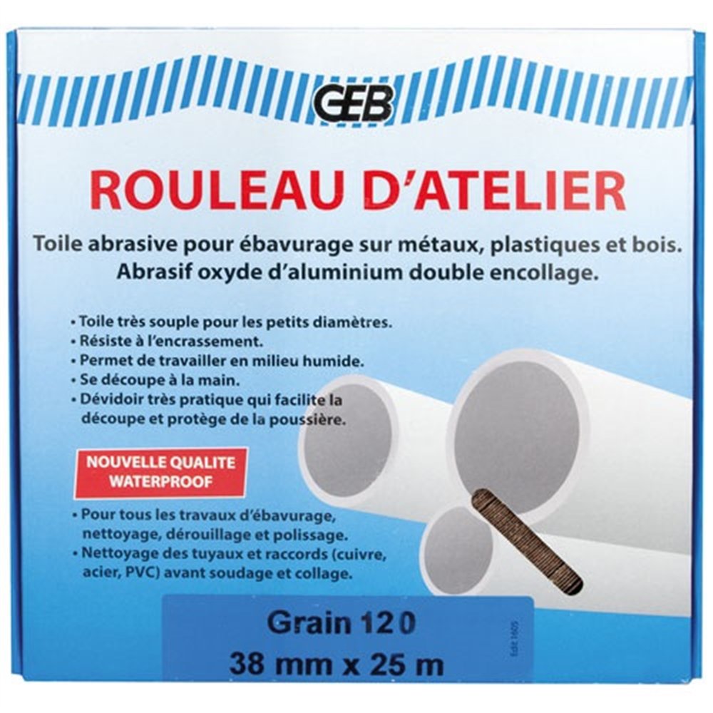 Le rouleau de toile abrasive waterproof 38 mm x 25 m de GEB est l'outil de référence pour tous les travaux de préparation sur tuyaux et raccords. Spécialement formulé pour résister à l'humidité, il convient à une utilisation en milieu humide ou aqueux sans perte de performance abrasive.