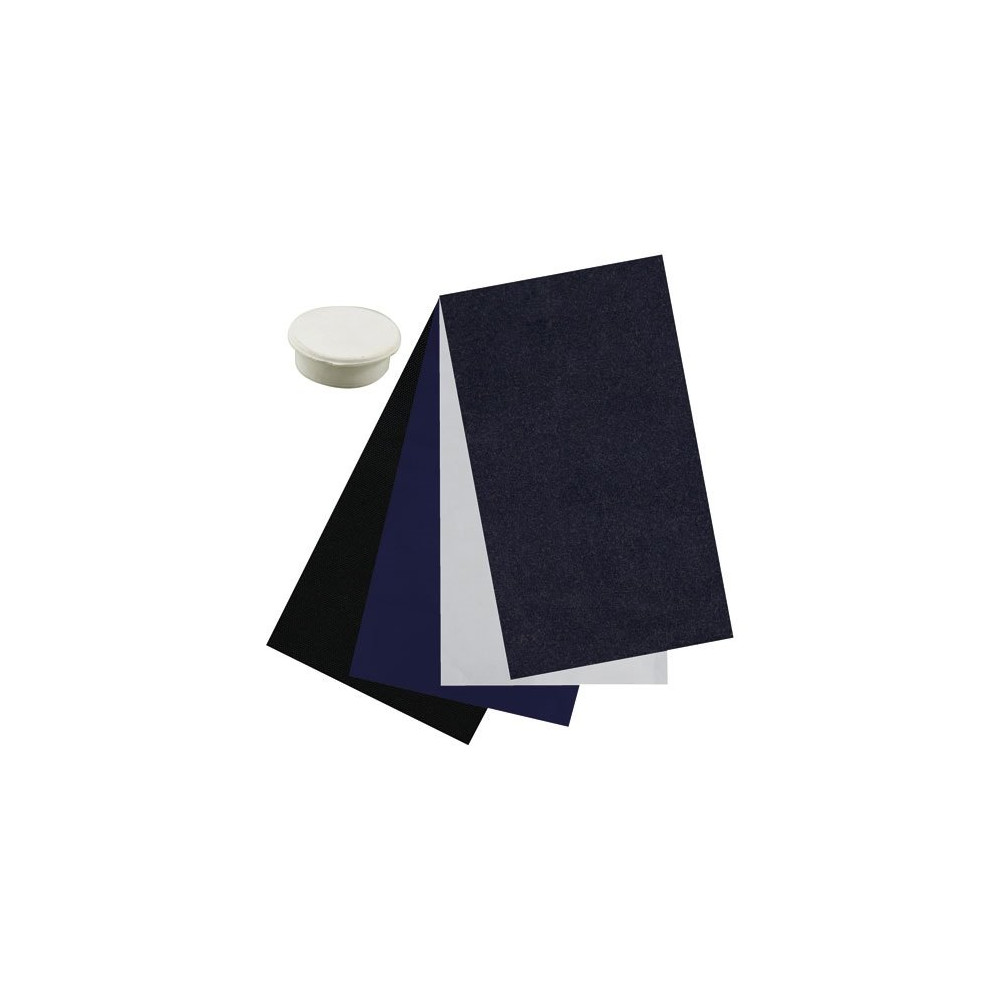 Le kit contient 5 éléments complémentaires pour couvrir toutes les situations : un bouchon de matelas pour gonfleur, deux patchs autoadhésifs PVC (un bleu et un transparent) de 15 x 7,5 cm chacun, un patch autoadhésif PVC floqué bleu de même dimension pour une réparation esthétique, et un patch autoadhésif polyester noir de 15 x 7,5 cm pour les matériaux spécifiques.