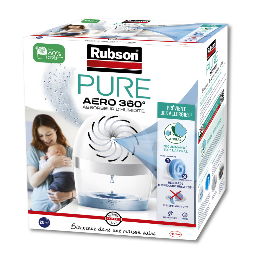 L'absorbeur AERO 360° Pure de Rubson représente une avancée significative dans la lutte contre l'humidité domestique. Grâce à sa technologie exclusive, l'air circule à 360° autour et au travers de la recharge, maximisant le contact entre l'air chargé d'humidité et le produit absorbant pour un résultat bien supérieur aux absorbeurs classiques.