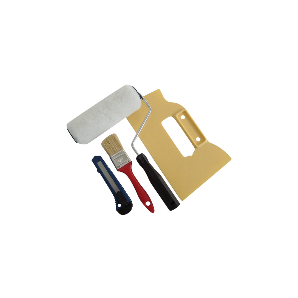1 rouleau manche polypro spécial colle larg.175 | 1 spatule à maroufler | 1 pinceau plat manche polypro larg.40 | 1 cutter 18mm | Présentation sous coque
