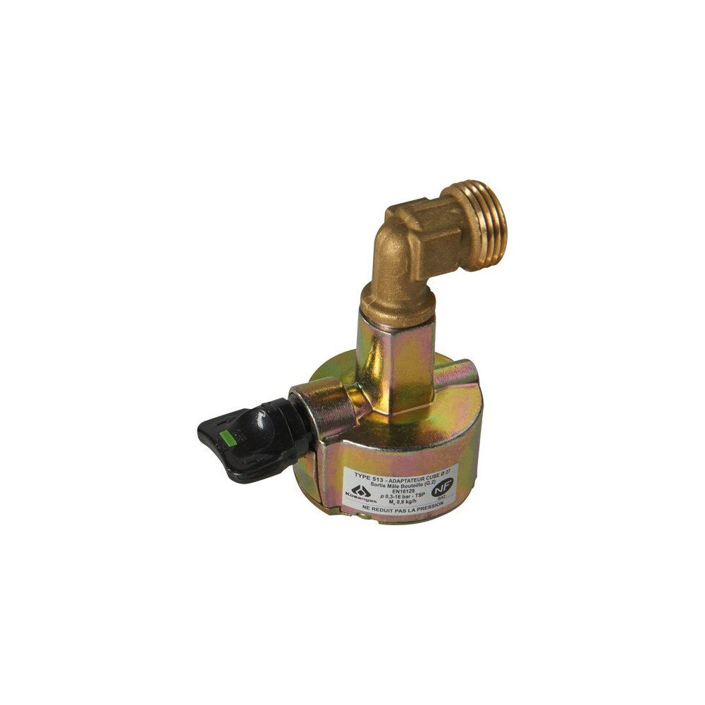 Techniquement, cet adaptateur dispose d'une entrée valve diamètre 27 mm et d'une sortie filetage mâle 21,7x1,814 à gauche, correspondant au standard des robinets de bouteilles de 13 kg. Il peut être utilisé comme robinet de coupure, mais ne remplace en aucun cas un détendeur : l'installation d'un détendeur approprié en aval reste obligatoire pour réguler la pression du gaz avant utilisation.