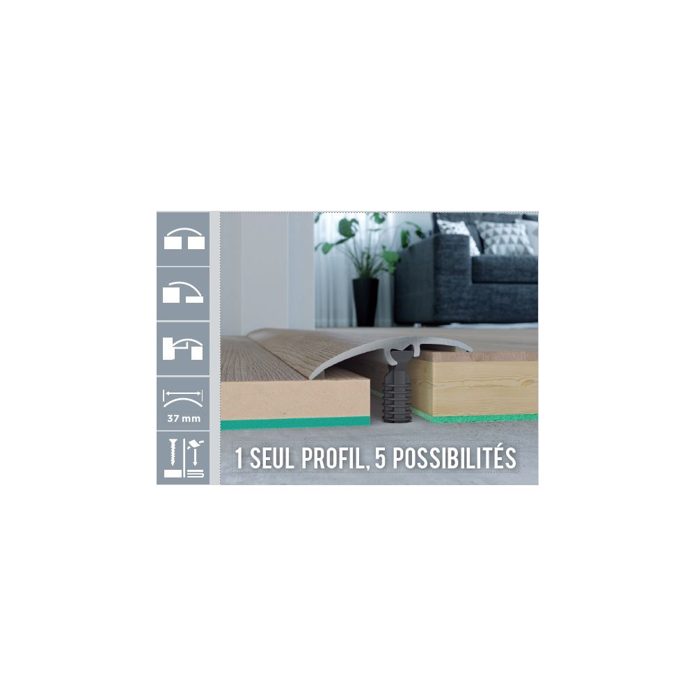 • Fonction 5 en 1 : seuil plat, seuil de recouvrement, réducteur, quart de rond, couvre-joint
