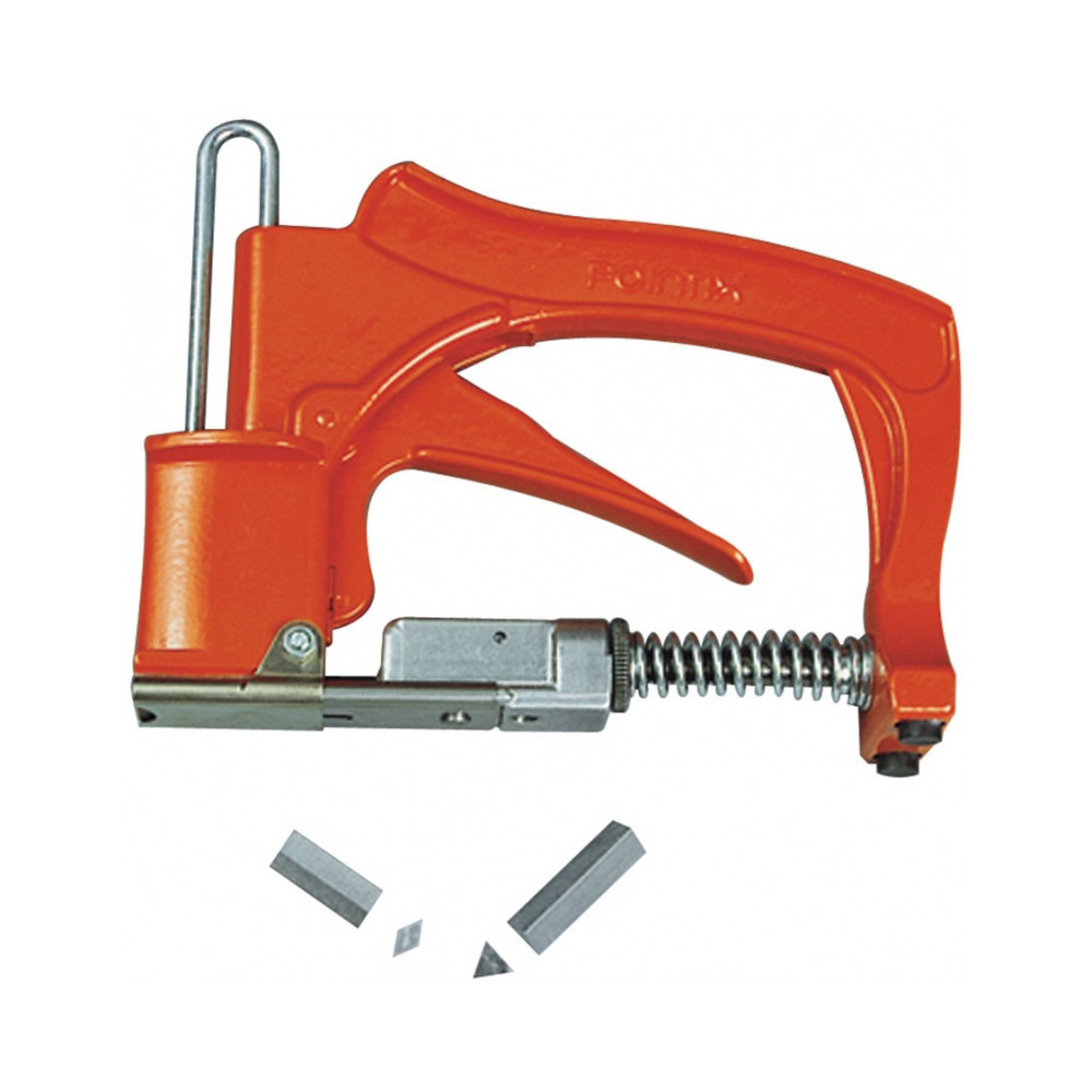 Agrafeuse de vitrier, peut recevoir aussi bien des pointes losanges que triangles de 10 à 11mm. Marteau de frappe en inox. Réglage de la force possible.