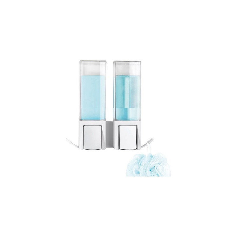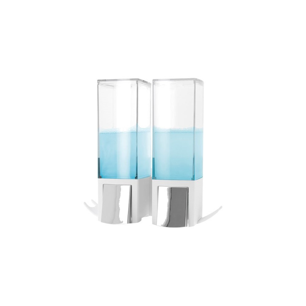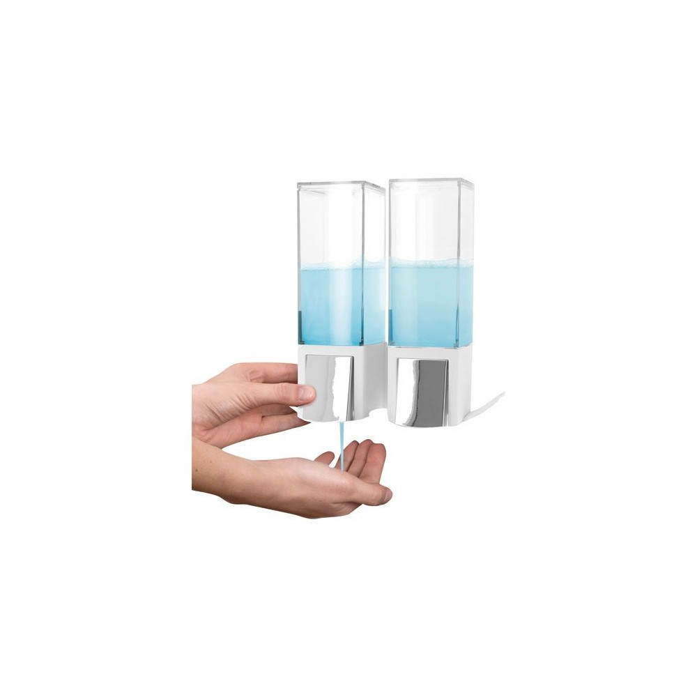 Le double distributeur de savon mural blanc Compactor est la solution parfaite pour organiser votre douche ou salle de bain en un seul geste. Avec ses 2 compartiments de 500 ml chacun (soit 1 litre de contenance totale), il permet de loger simultanément gel douche, shampoing ou savon liquide, en évitant l'accumulation de flacons sur la tablette.
