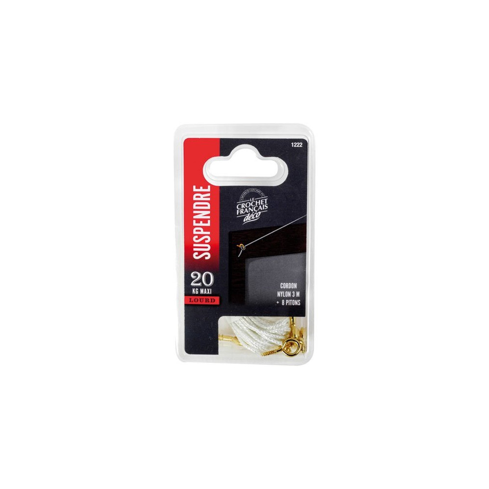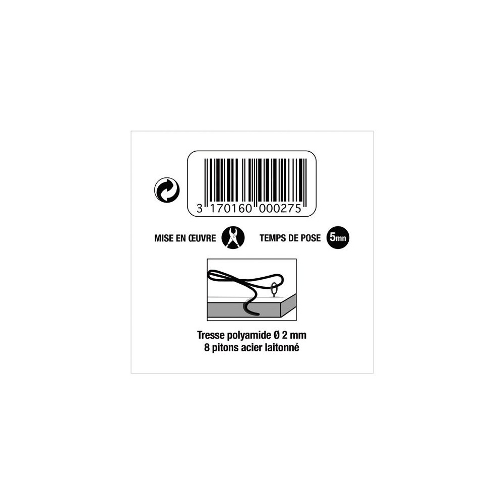 Le kit se compose d'un cordon polyamide tressé de qualité associé à 8 pitons en acier laitonné, garantissant une résistance optimale à la traction et une excellente tenue dans le temps. L'acier laitonné assure également une bonne résistance à la corrosion, idéal pour une utilisation prolongée en intérieur.