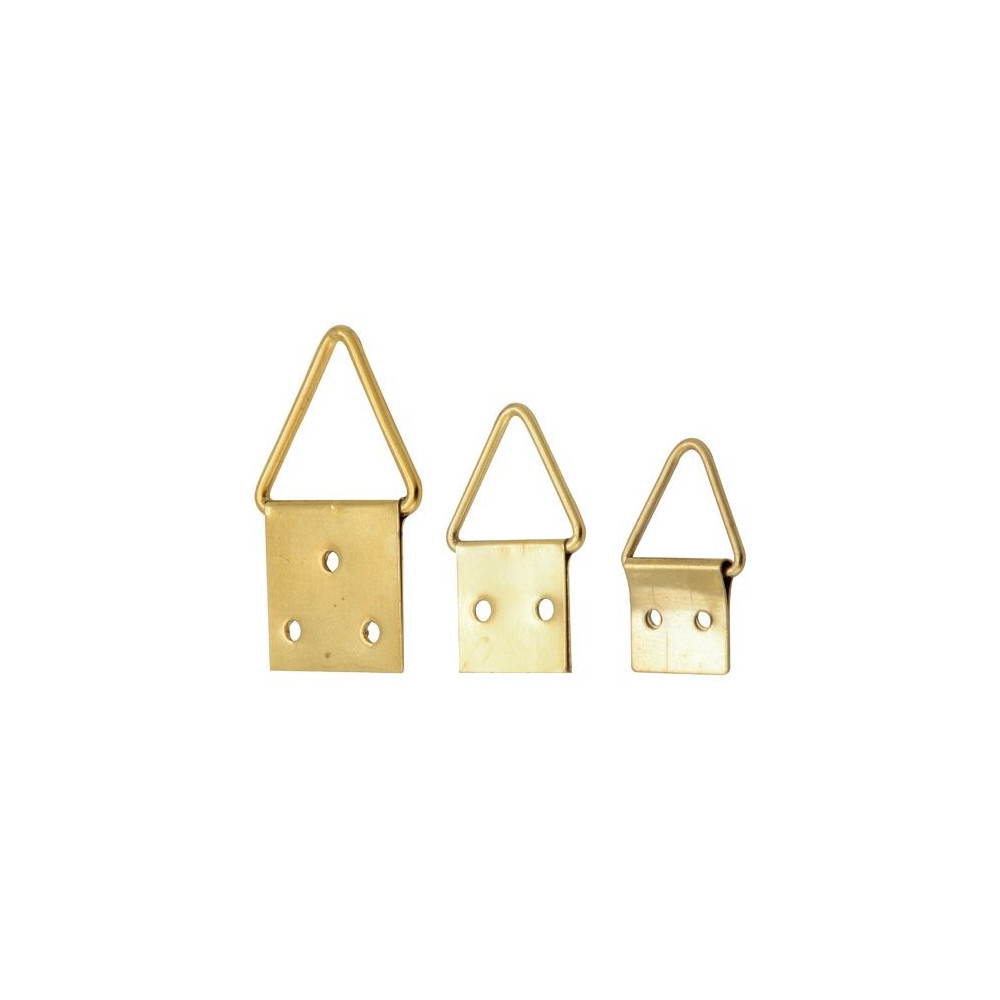 Le triangle accorche tableau laitonné lot de 9 assortis de chez Le Crochet Français permet de suspendre aisément vos tableaux et cadres légers. Composition : 3 triangles 10 mm, 3 triangles 15 mm, 3 triangles 20 mm, pointes dorées. Les plus produit, facile et rapide à poser. Dimensions : triangle 10 mm : l 1,0 x P 0,2 x H 1,9 cm ; triangle 15 mm: l 1,5 x P 0,2 x H 2,4 cm ; triangle 20 mm : l 2,0 x P 0,3 x H 3,2 cm. Mise en œuvre, marteau.