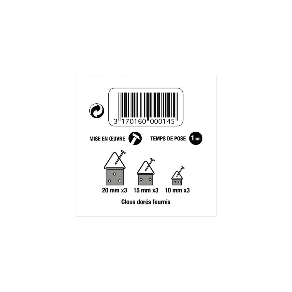 Suspendre un tableau ou un cadre n'a jamais été aussi simple grâce au lot de 9 triangles d'accrochage assortis Le Crochet Français. Ce blister propose une sélection complète de triangles laitonnés en trois formats différents, adaptés à toutes les dimensions de cadres légers que vous souhaitez mettre en valeur.