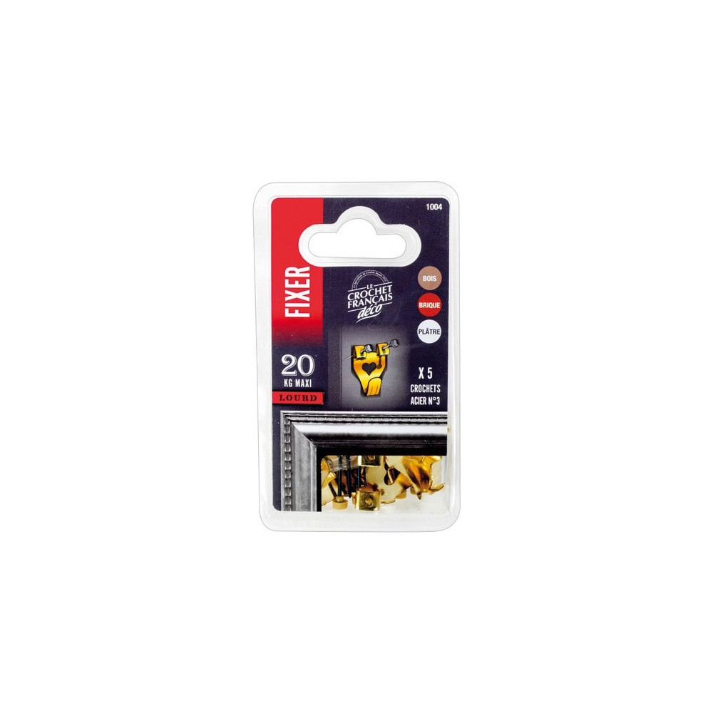 Le crochet acier laitonné n°3 de Le Crochet Français est la solution idéale pour accrocher vos tableaux et cadres légers sans effort ni risque d'endommager vos murs. Vendu en lot de 5 crochets, ce produit allie praticité et résistance pour répondre aux besoins les plus courants en matière d'accrochage mural.
