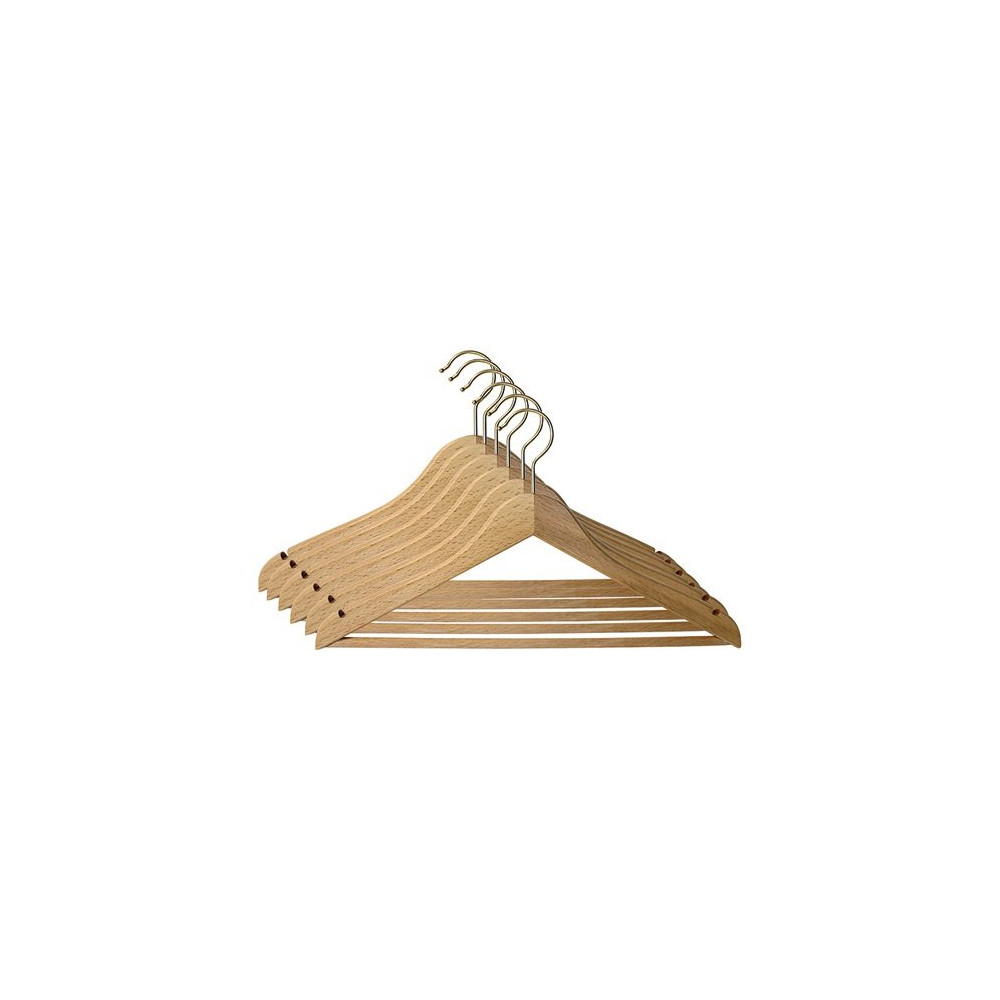 Fabriqués en bois galbé verni, ces cintres mesurent 45 cm de large, une taille standard adaptée à la majorité des vêtements adultes — vestes, chemises, manteaux ou robes. Le galbe épouse naturellement la forme des épaules pour préserver la coupe des vêtements dans le temps, tandis que le vernis protège le bois et lui confère un aspect lisse et esthétique.