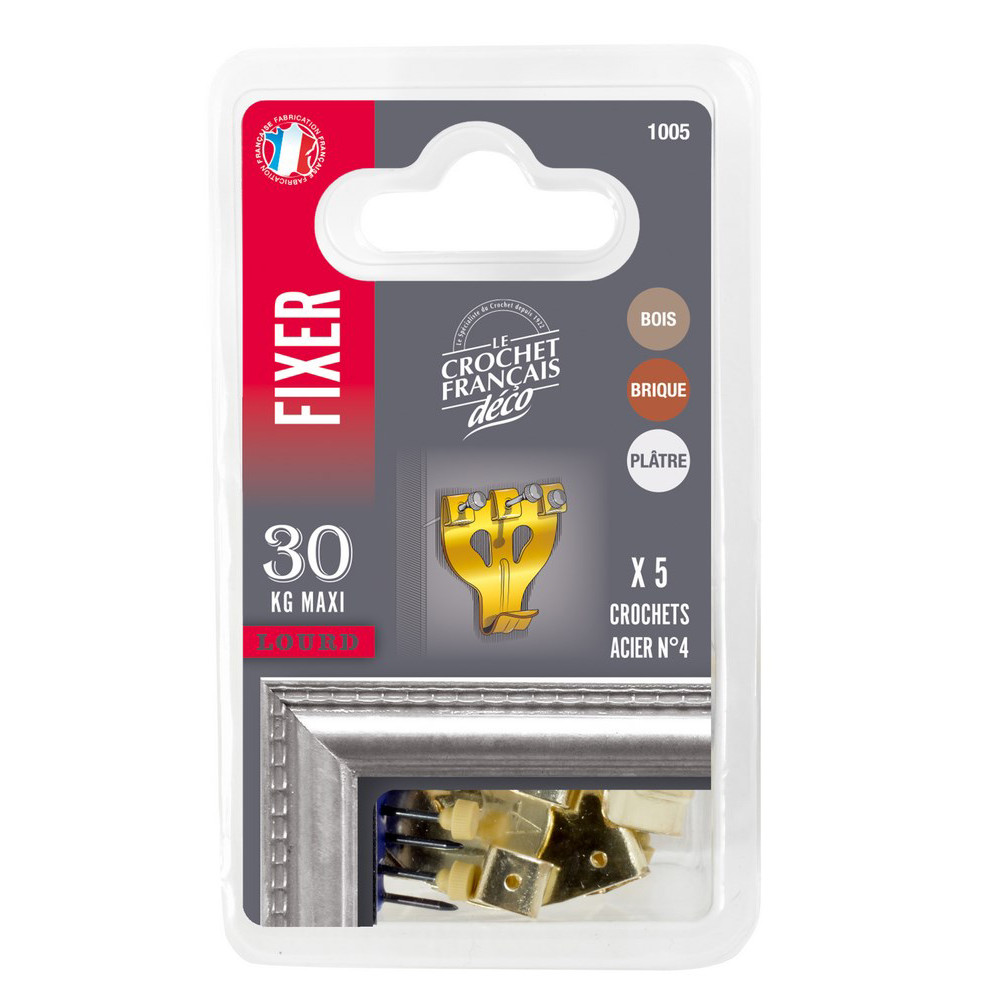 Accrocher un tableau ou un cadre photo au mur en toute sécurité et sans dégâts, c'est l'engagement des crochets acier n°4 du Crochet Français. Ce lot de 5 crochets en acier laitonné est accompagné d'aiguilles en acier trempé haute résistance, garantissant une fixation solide et pérenne dans la plupart des types de murs.