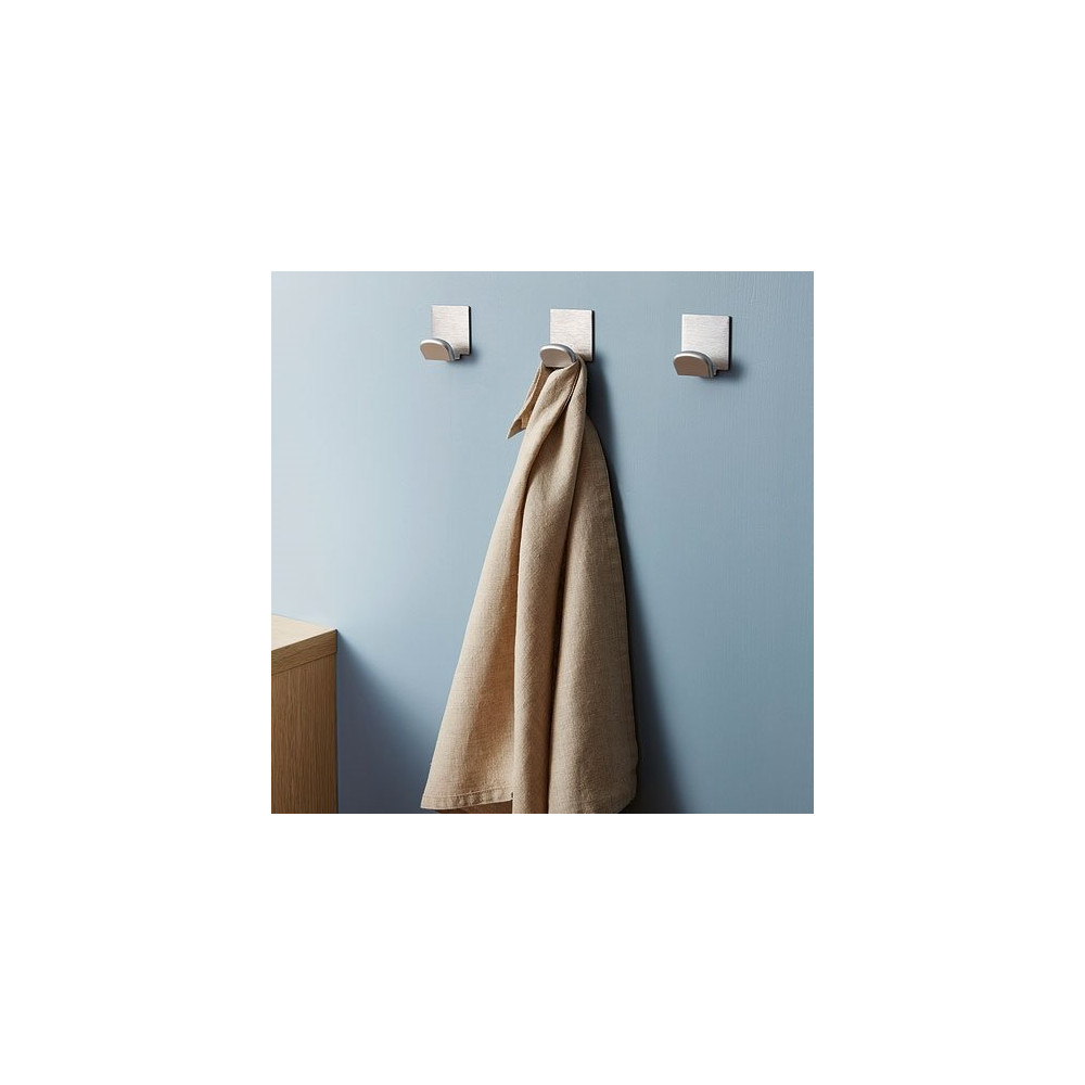 La base en acier inoxydable finition chrome mat lui confère une excellente résistance à l'humidité et aux taches, le rendant particulièrement adapté aux pièces d'eau. Le système adhésif haute performance assure une fixation solide et durable sur la plupart des surfaces lisses : carrelage, verre, bois verni, métal peint ou stratifié.