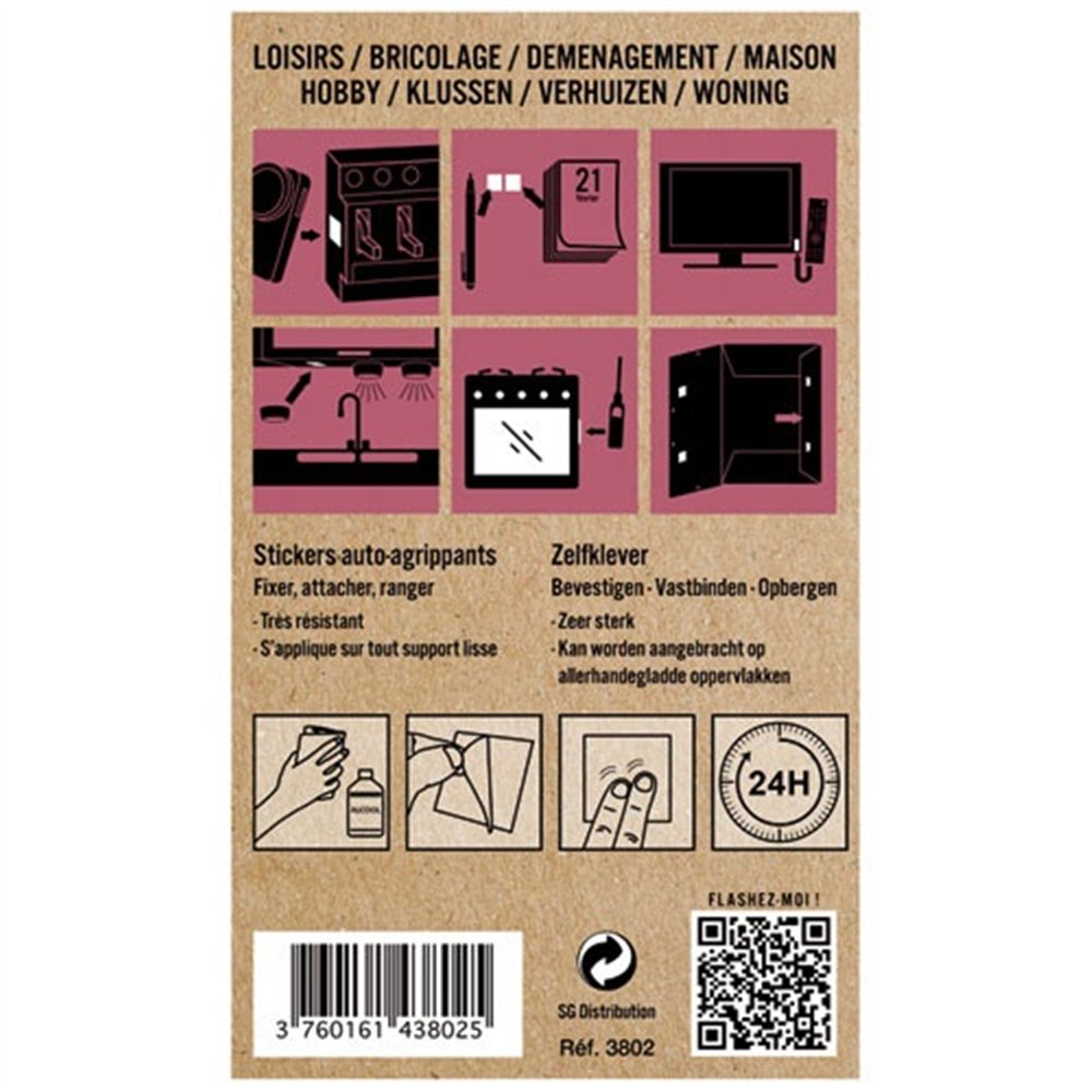 Pour tout accrocher, fixer, ranger. S'applique sur toute surface lisse, autoagrippant. Système adhésif très résistant. Réutilisable des milliers de fois. Evite les trous dans les supports ou les murs. Pratique et facile à utiliser.