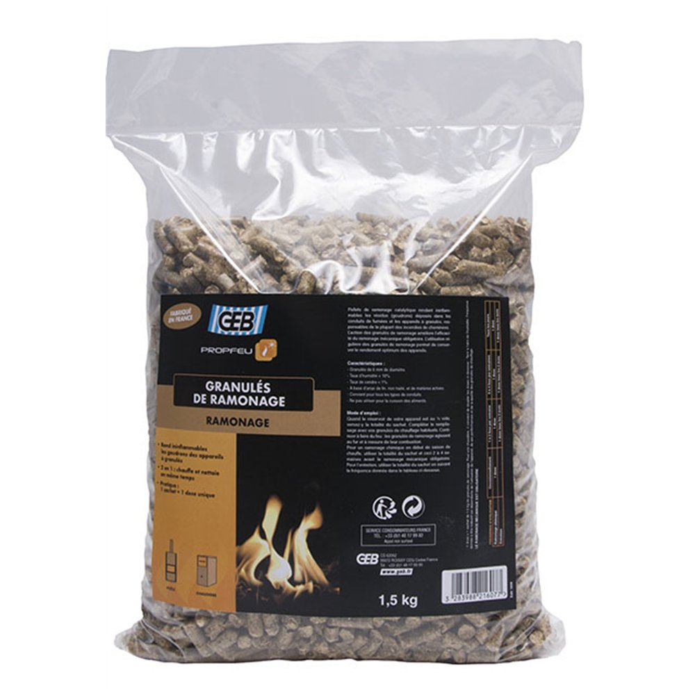 Les granulés de ramonage étui de 1,5 Kg de la marque GEB sont indispensables pour effectuer le ramonage catalytique. Ce processus permet d'entretenir les conduits des poêles, des cheminées et des chaudières. Une dose de granulés va détruire les résidus goudronneux et la suie accumulés. Ces résidus doivent être impérativement traités car ils augmentent considérablement les risques d'incendies de cheminées. Usage: entretien des cheminées, poêles et chaudières. Compatibilité: utilisable sur tous le
