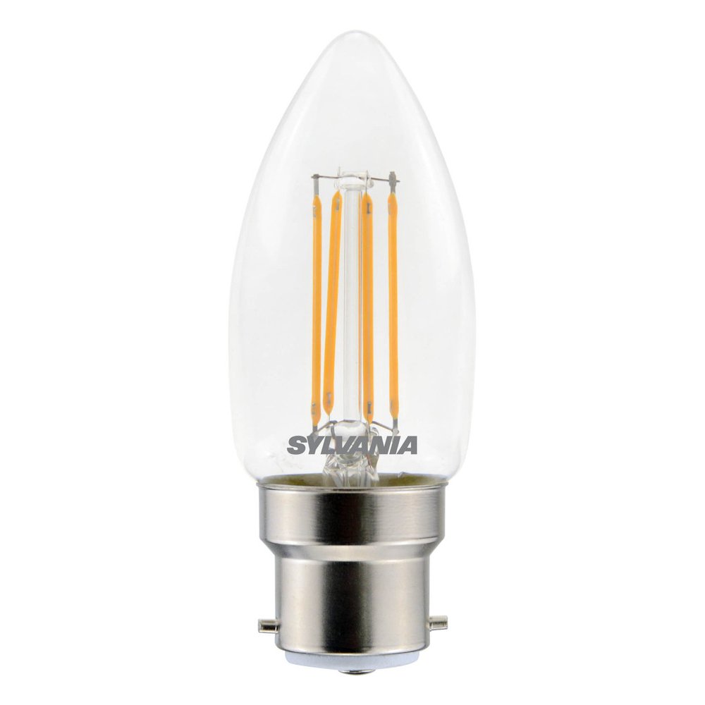 L'ampoule LED Flamme B22 4,5W Sylvania allie l'esthétique vintage des ampoules à filament à la technologie LED la plus aboutie. Avec un rendu lumineux de 470 lumens pour seulement 4,5W consommés, elle offre jusqu'à 90 % d'économies d'énergie par rapport à une ampoule à incandescence équivalente, pour une efficacité remarquable de 104 lm/W.
