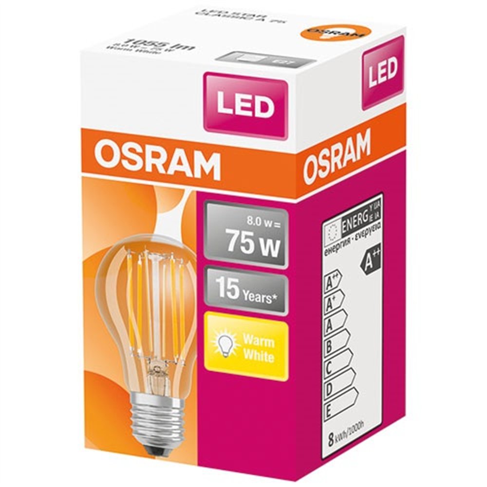 L'ampoule LED à filament OSRAM 8W équivalent 75W en finition verre clair est le mariage réussi entre l'esthétique des ampoules d'antan et les performances de la technologie LED actuelle. Son filament lumineux visible à travers le verre transparent crée un effet décoratif chaleureux, tandis que sa lumière blanc chaud instaure une atmosphère douce et conviviale dans n'importe quelle pièce.