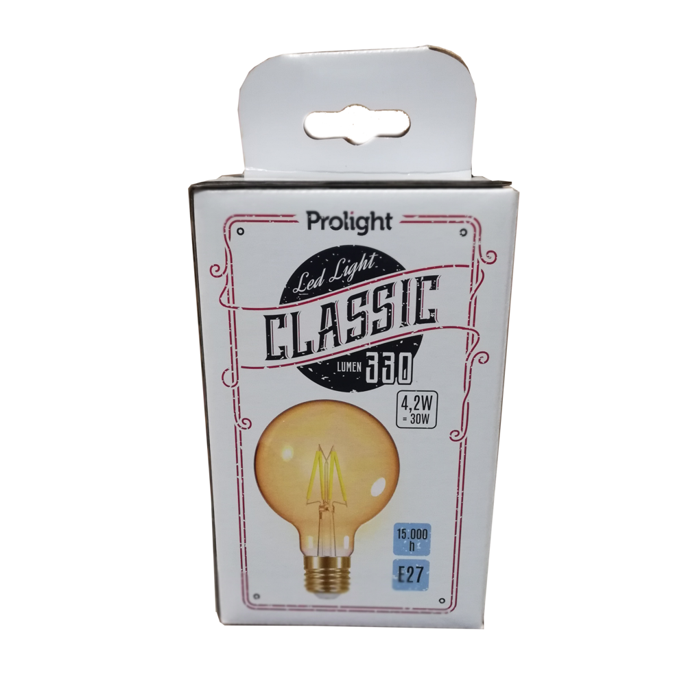 L'ampoule Vintage Globe PROLIGHT Ø80 LED E27 4,2W marie habilement le charme rétro des ampoules à filament et la performance contemporaine de la technologie LED. Son design globe de 85 mm de diamètre et sa hauteur de 123 mm en font une pièce décorative à part entière, aussi belle éteinte qu'allumée, idéale pour les luminaires ouverts, suspensions, guirlandes ou appliques murales.