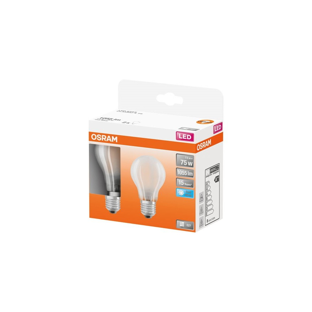 Profitez d'une offre avantageuse avec le lot de 2 ampoules LED standard Full Glass OSRAM 7,5W E27 blanc froid. Ces ampoules au design entièrement en verre blanc laiteux se distinguent par leur esthétique soignée et leur rendu lumineux impeccable. Avec 7,5W de consommation, elles délivrent un flux lumineux soutenu dans une teinte blanc froid, idéale pour les espaces fonctionnels.