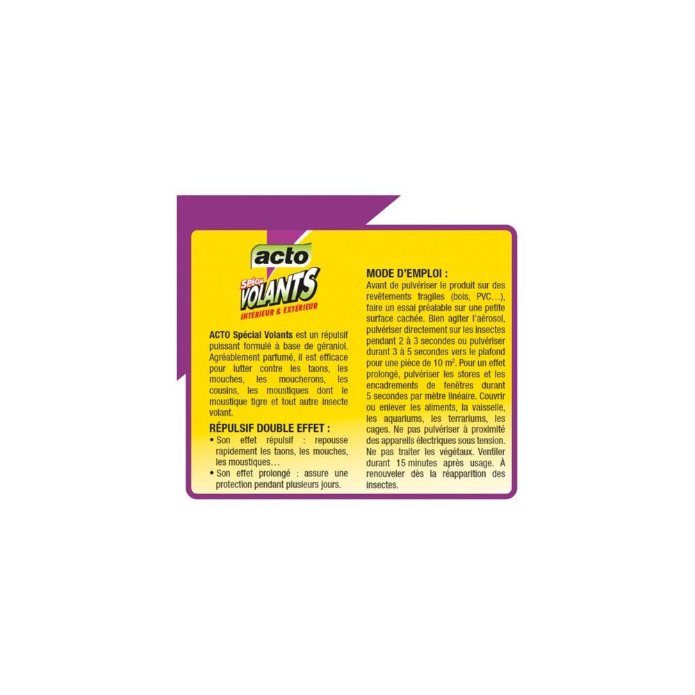 Profitez pleinement du jardin et des espaces extérieurs sans être importuné par les insectes volants grâce à l'aérosol répulsif ACTO Spécial Volants en format 500 ml. Formulé à base de géraniol, un actif naturel reconnu pour son efficacité, ce produit offre une protection rapide et durable contre une large variété d'insectes.