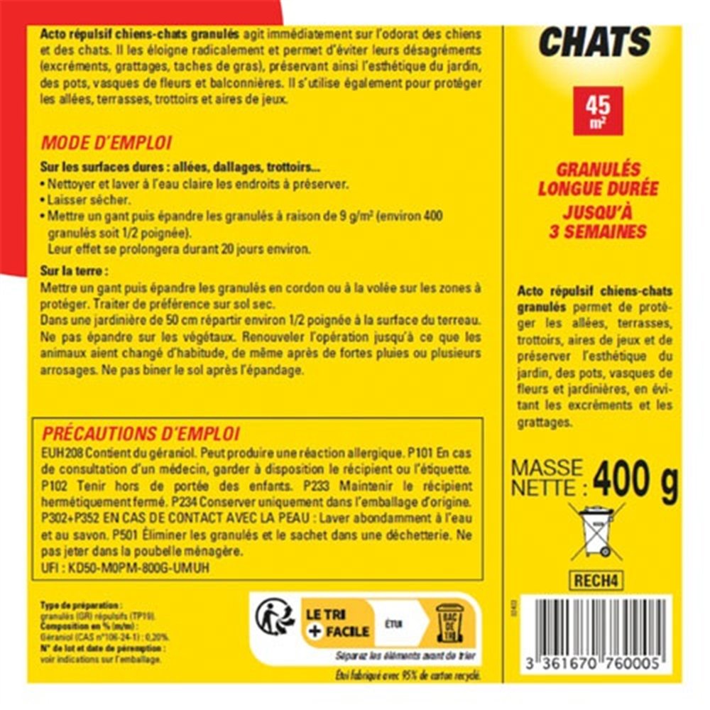 Protégez efficacement votre jardin, vos allées et vos massifs avec le répulsif chien chat ACTO en granulés recharge 400 g. Formulés à base de substances répulsives à effet olfactif, ces granulés exploitent la sensibilité olfactive accrue des chiens et des chats pour les dissuader naturellement de pénétrer dans les zones traitées, sans les blesser ni les stresser.
