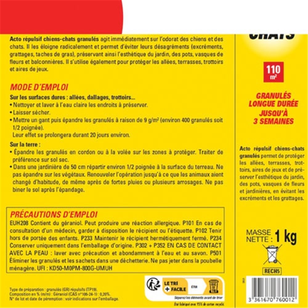 Le répulsif chien et chat Acto en recharge de 1 kg est une solution efficace et économique pour protéger vos espaces extérieurs des intrusions indésirables de chiens et chats. Formulé pour agir sur l'odorat particulièrement développé de ces animaux, ce produit crée une zone de dissuasion naturelle autour des zones traitées.