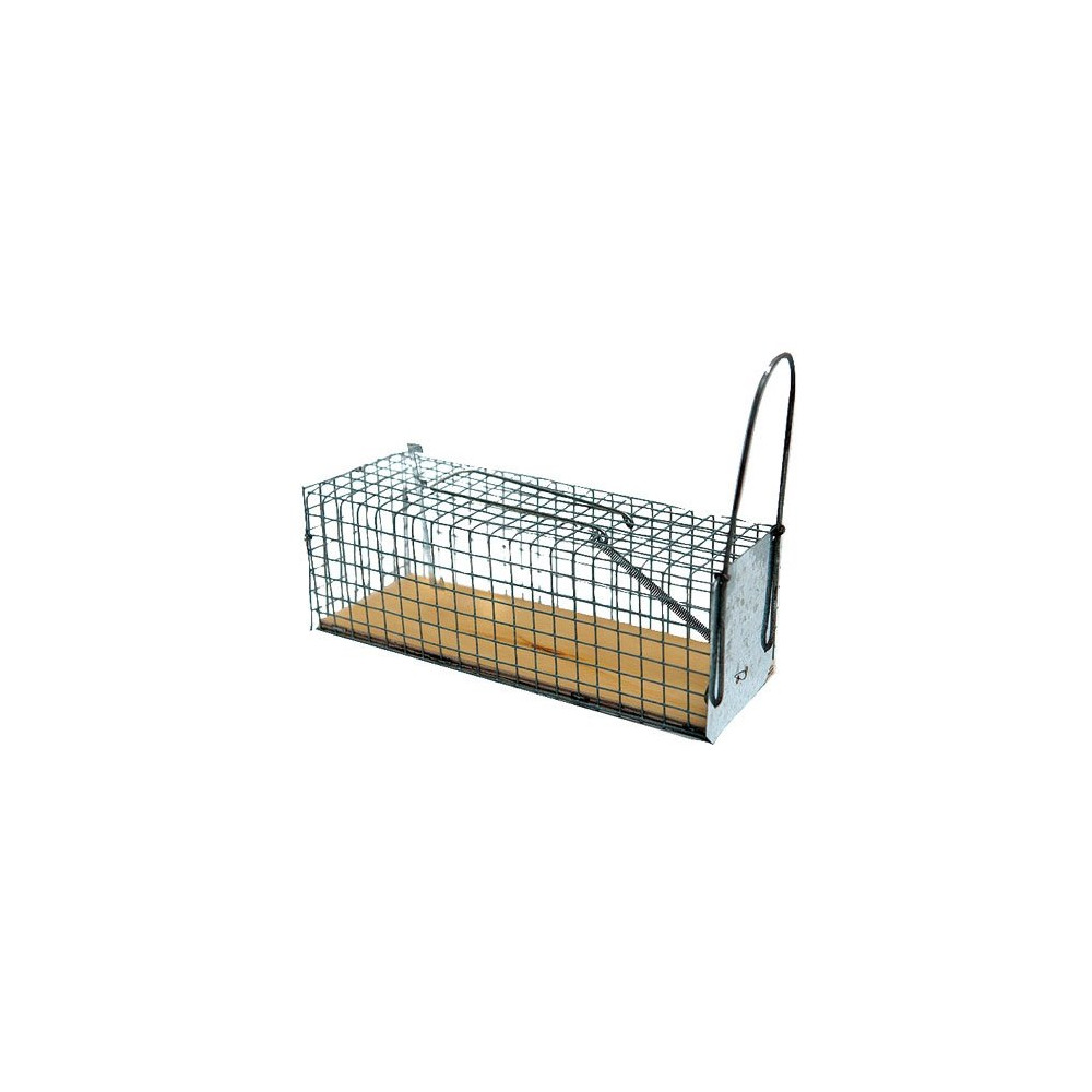 Fabriquée en grillage galvanisé, cette nasse offre une excellente résistance à la corrosion et aux intempéries, garantissant une durabilité optimale même en extérieur. Son socle en bois stabilise l'ensemble sur le sol et rassure le rongeur qui perçoit une surface naturelle sous ses pattes. Ses dimensions de 27 x 9 x 9 cm sont parfaitement adaptées à la taille d'un rat adulte.