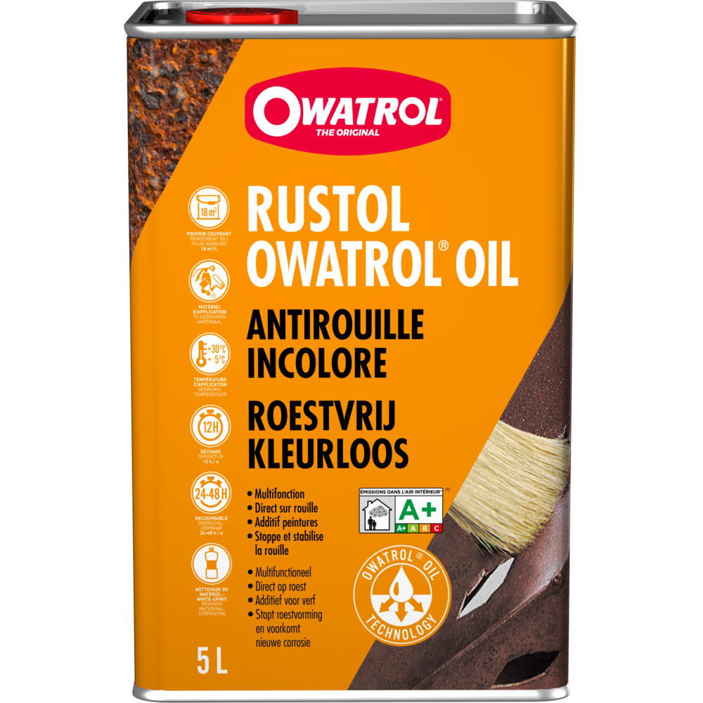 Pour les chantiers de grande ampleur ou une utilisation régulière, le Rustol Owatrol en bidon de 5 litres (réf. 734) est la solution la plus économique de la gamme. Ce grand format de 5 litres permet de traiter des surfaces métalliques étendues tout en bénéficiant de l'expertise reconnue d'Owatrol en matière de protection antirouille professionnelle.