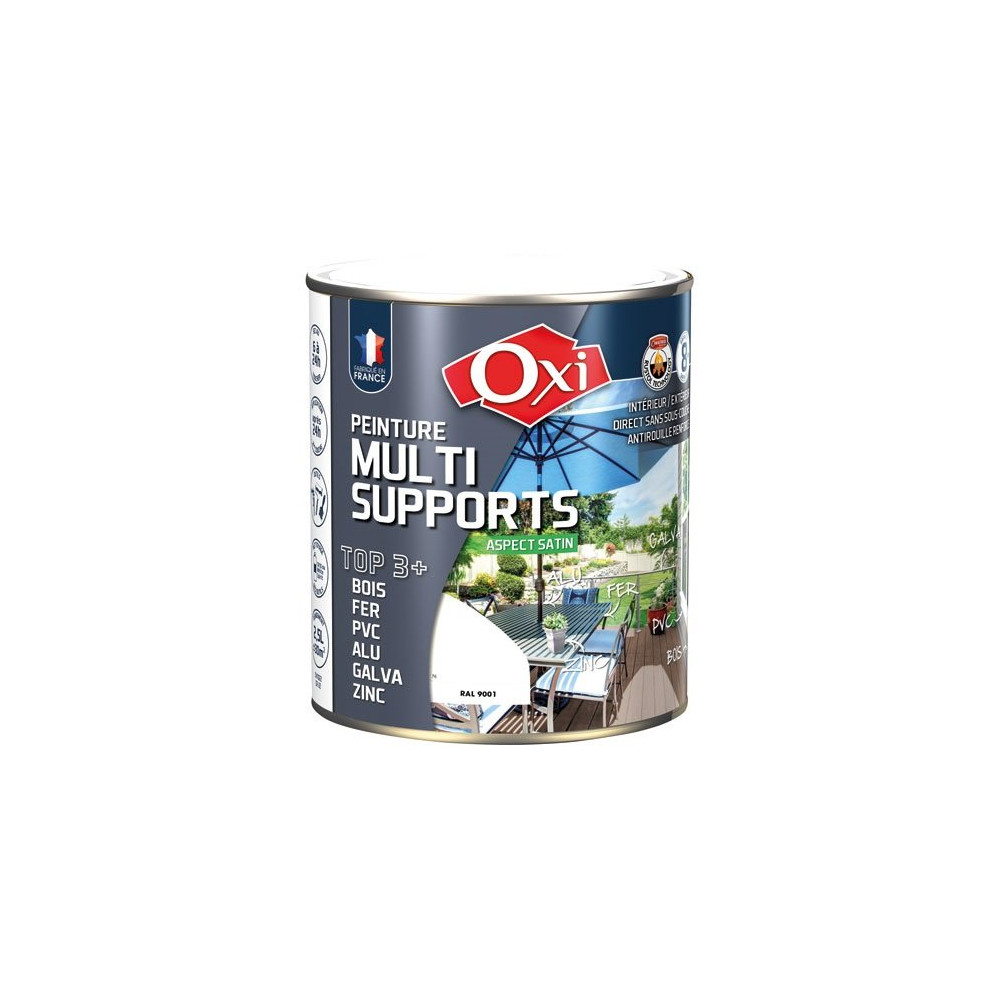Existe en plusieurs coloris La peinture satin multi-support TOP3 de 2.5 L en coloris blanc crème RAL9001 de la marque Oxi est destinée à la décoration et la protection de nombreux matériaux bois, fer, PVC, métaux non ferreux, intérieurs et extérieurs. TOP3+ est une formule solvantée composée de résines de qualité supérieure et renforcée grâce à la « RUSTOL Technology ». Sur BOIS, TOP3+ est microporeux et protège de l'humidité, il s'oppose, sans cloquer, au vieillissement et à la dégradation des