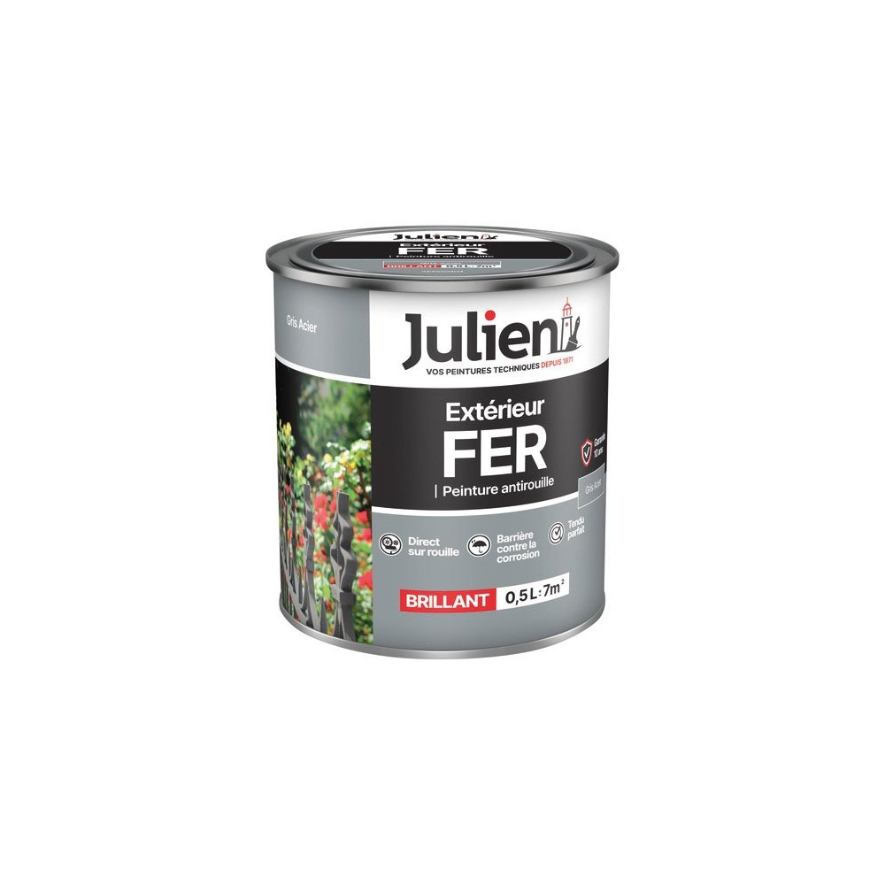 Protégez vos métaux ferreux avec l'efficacité d'une peinture professionnelle : la Peinture Fer Antirouille Julien coloris Gris Acier en 0,5 L allie esthétique industrielle et protection haute performance. Son teinte gris acier, à la fois sobre et moderne, s'intègre parfaitement aux portails contemporains, aux grilles de clôture ou aux structures métalliques exposées.