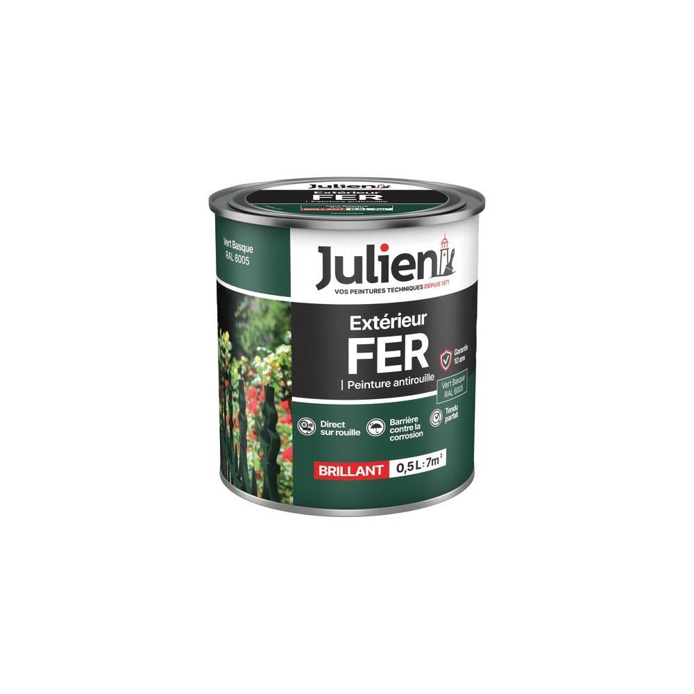 Formulée pour l'extérieur, cette peinture JULIEN protège en profondeur tous vos métaux ferreux en formant une barrière physique imperméable à l'air et à l'humidité, les deux principaux agents responsables de la corrosion. Sa résistance élevée aux agressions extérieures — pluie, UV, sel marin, gel — lui permet de maintenir son efficacité protectrice saison après saison, sans perte d'adhérence ni altération du coloris. Le format 0,5L est idéal pour les petites surfaces, retouches ou travaux ponctuels.