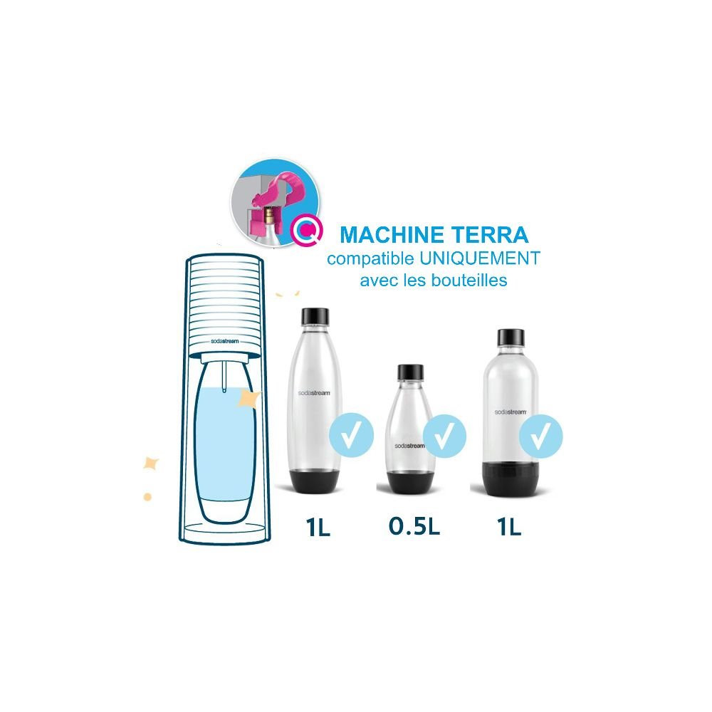 Retrouvez la SodaStream Terra noire et ses accessoires (cylindres, bouteilles, sirops) chez Brikoleur. Attention, la machine Terra est compatible uniquement avec les bouteilles SodaStream à clipser — vérifiez la compatibilité de vos accessoires existants avant l'achat.