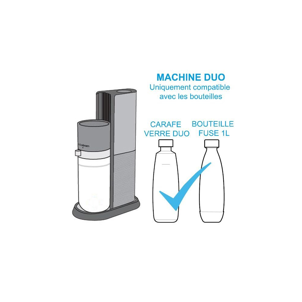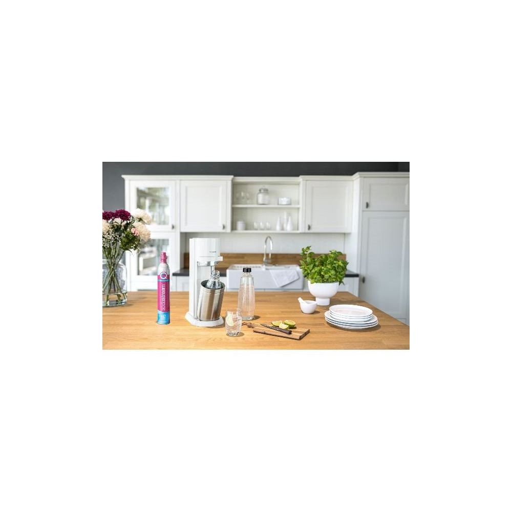 Le modèle Duo blanc se démarque par sa compatibilité avec deux types de bouteilles : les bouteilles plastique SodaStream réutilisables et les bouteilles en verre, une exclusivité de la gamme Duo. Ce choix vous permet d'adapter votre utilisation selon les moments — verre pour la table dressée, plastique pour les sorties ou pique-niques. Le tout sans aucun branchement électrique, grâce aux cylindres CO₂ SodaStream rechargeables (jusqu'à 60 litres par cylindre).