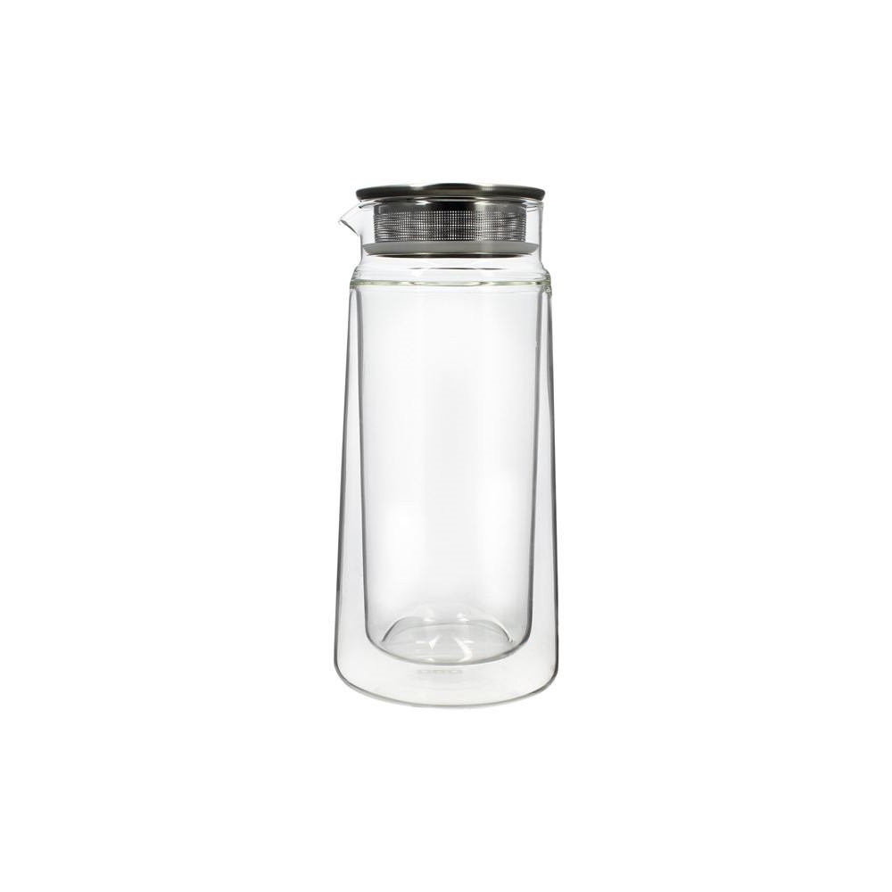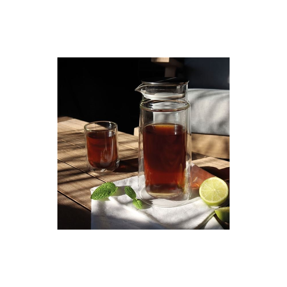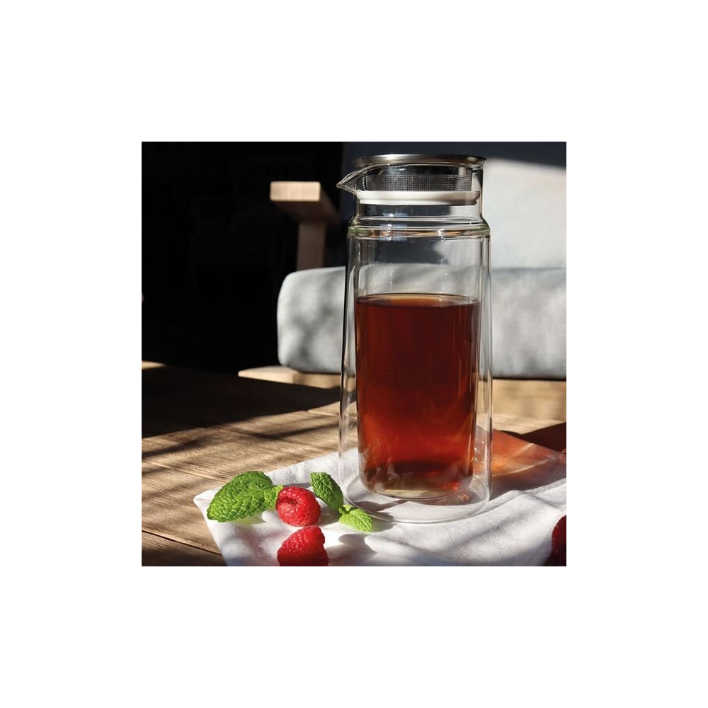 Sa conception en double paroi en verre borosilicate crée une barrière thermique efficace qui maintient vos boissons chaudes plus longtemps tout en gardant l'extérieur à température ambiante — plus de risque de se brûler les mains. L'infuseur intégré au couvercle permet de préparer directement dans la carafe des thés, tisanes ou infusions de fruits avec un contrôle parfait du temps d'infusion. La finition transparente met en valeur les couleurs naturelles de vos préparations.
