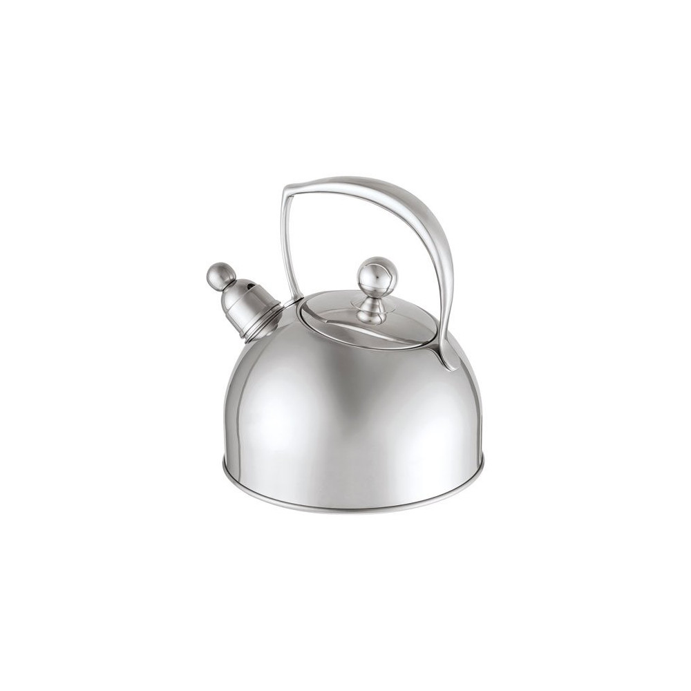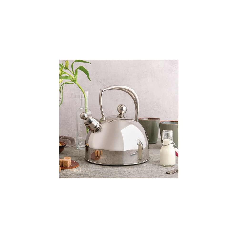 Fabriquée en acier inoxydable, la bouilloire Suzy 2,5 L est robuste, hygiénique et facile à entretenir. Elle est dotée d'un sifflet intégré qui retentit dès que l'eau atteint l'ébullition, vous évitant ainsi de surveiller constamment la cuisson. Sa poignée ergonomique assure une prise en main sécurisée même lorsque la bouilloire est pleine.