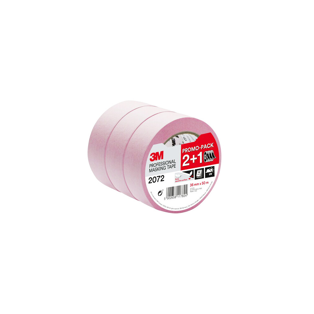 Reconnaissable à sa teinte rose caractéristique, le ruban de masquage Scotch 2072 Extra Sensitive a été spécialement formulé pour les surfaces particulièrement délicates. Ce lot avantageux 2+1 gratuit en format 36 mm × 50 m vous assure une bonne réserve pour vos chantiers de peinture intérieure, avec la tranquillité d'esprit d'un masquage irréprochable.