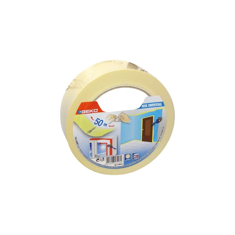 Le ruban adhésif de masquage universel GEKO 38 mm x 50 m est un incontournable du chantier et des travaux de finition. Formulé avec un adhésif à solvant, il est spécialement conçu pour une utilisation polyvalente aussi bien en intérieur qu'en extérieur, sur une grande variété de supports : murs, bois, métal, PVC ou encore vitrages.