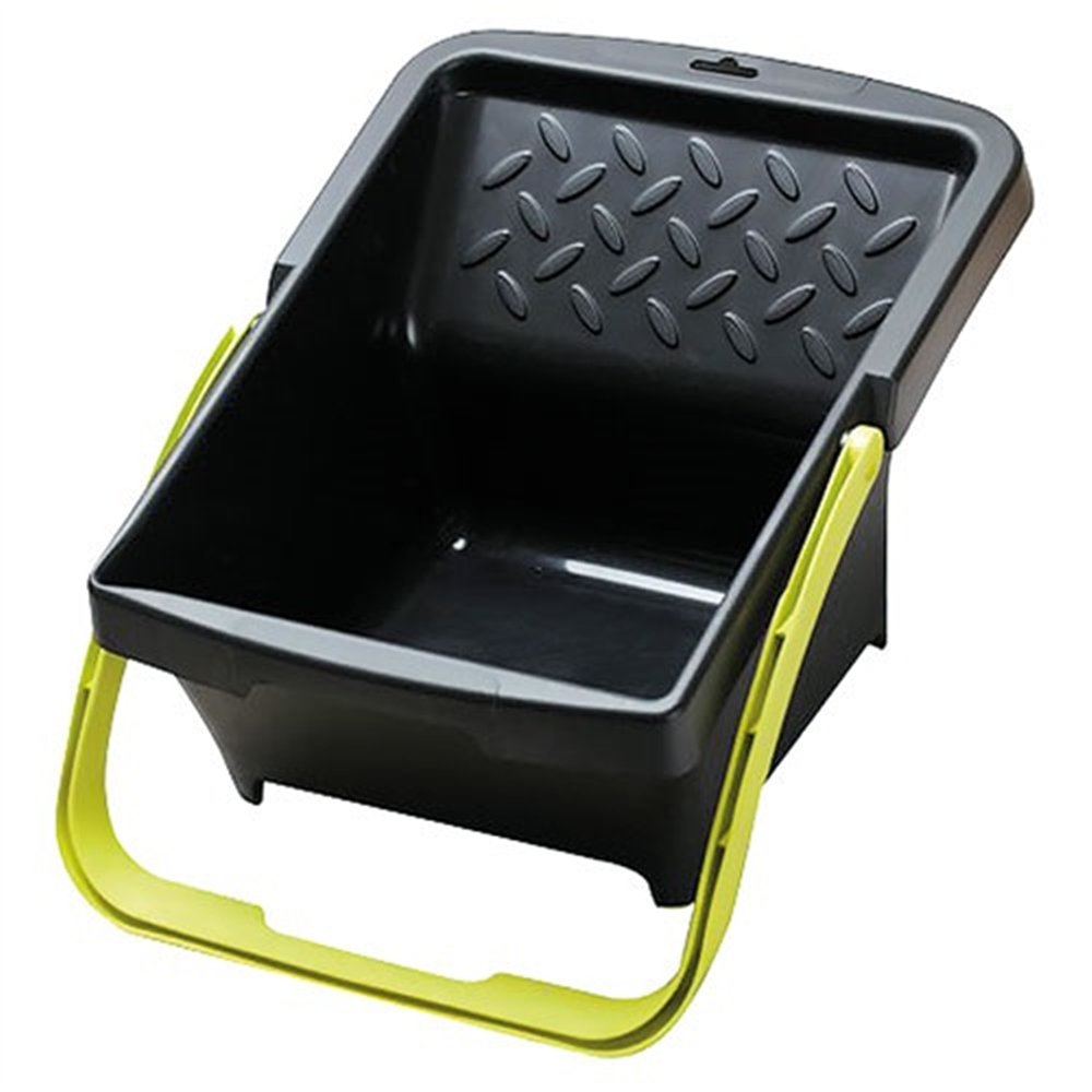 L'un des points forts de ce bac réside dans son système anti-basculement : lorsqu'une rallonge est utilisée, l'anse verrouillée par le pied stabilise l'ensemble, évitant les renversements accidentels de peinture — un détail qui change radicalement le confort de travail en hauteur. Le porte-rouleau intégré permet de déposer le rouleau sans le laisser traîner sur la toile de protection.