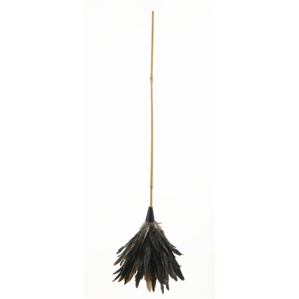 Sa tête est composée de plumes de coq dans leur teinte naturelle, non colorées, ce qui traduit le respect des matières brutes et une approche minimaliste de l'entretien ménager. Ces plumes fines et souples sont réputées pour leur capacité à se faufiler entre les objets et à capter les poussières sans les souffler, grâce à leur légère charge électrostatique naturelle.