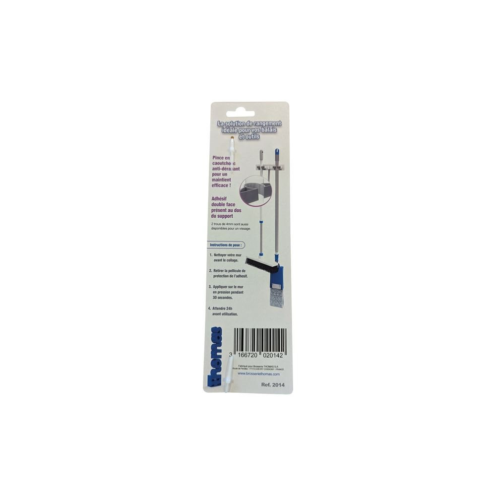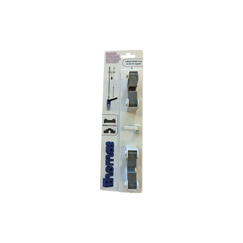 Chaque accroche est conçue avec un revêtement antidérapant qui maintient fermement les manches sans les rayer, ainsi qu'un crochet supplémentaire intégré pour accrocher d'autres articles ménagers (chiffons, sacs, etc.). La fixation est doublement assurée : par un adhésif double face puissant au dos du support pour une pose sans perçage, et par 2 trous de 4 mm permettant une fixation vissée pour plus de solidité sur les surfaces difficiles ou les charges plus importantes.