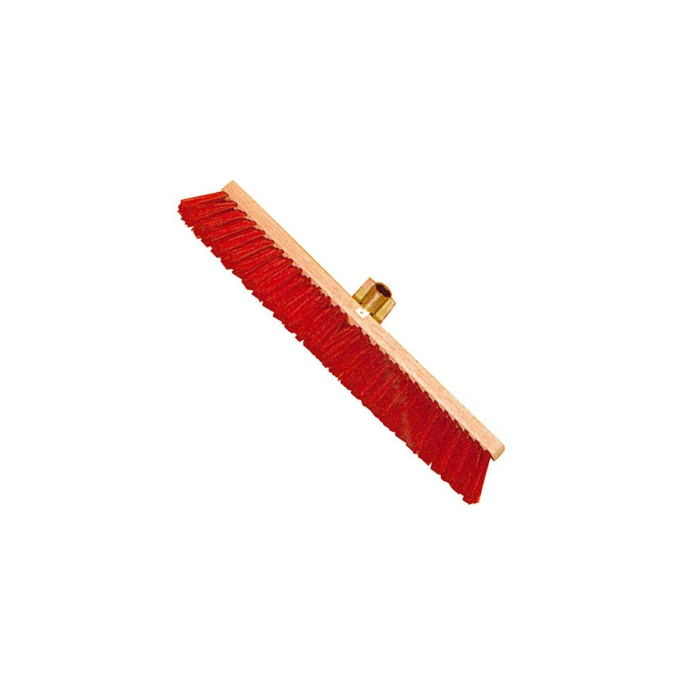 Balai cantonnier monture bois. Fibres: PVC rouge diamètre 0.85mm. Douille métal. Longueur des fibres: 70mm. Nb de touffes: 142. Dimensions totales (Lxlxh): 600x85x135mm. Dimensions monture (Lxlxh): 600x55x20mm. Poids: 950g. Fabriqué en France.