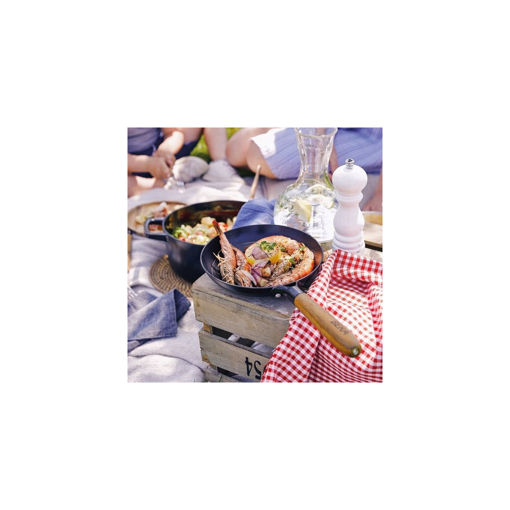 Conçue en fer de haute qualité avec un revêtement céramique antiadhésif, la Mandala allie les atouts thermiques de la fonte — montée en température rapide et chaleur bien répartie — à une légèreté appréciable qui facilite la manipulation au quotidien. Fini les poêles trop lourdes qui fatiguent les poignets ! La poignée ergonomique reste froide pendant la cuisson pour plus de sécurité.