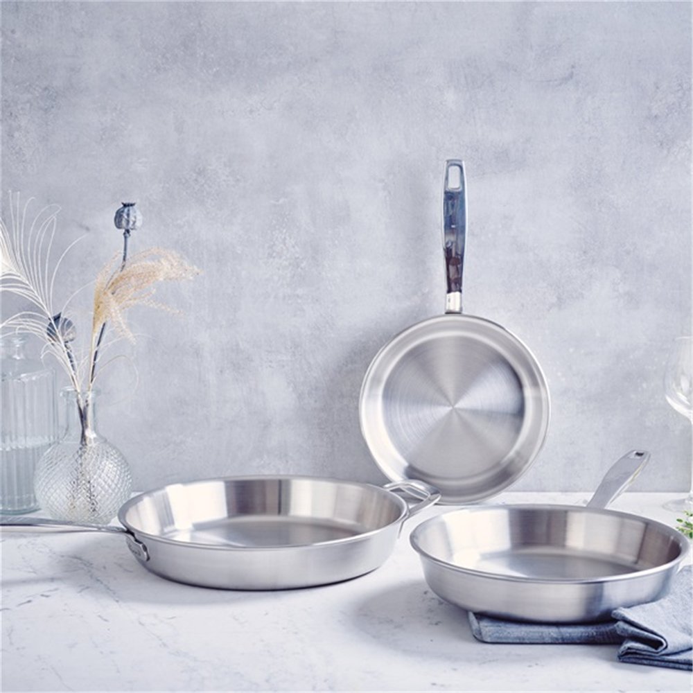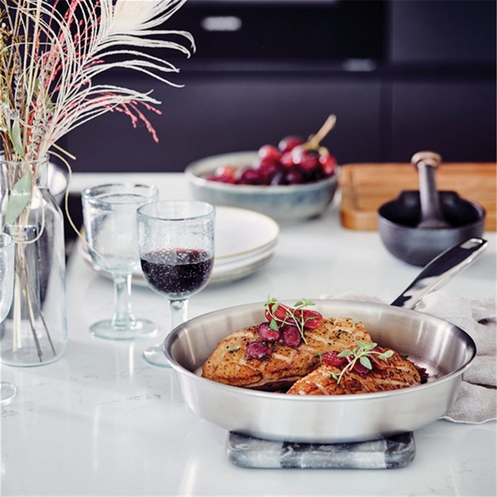 La surface en inox brut développe, avec le temps et une utilisation adaptée, des propriétés antiadhésives naturelles. Elle supporte les hautes températures et les passages au four, ce qui la rend particulièrement polyvalente pour saisir, dorer ou mijoter. Sa conception robuste garantit une durée de vie bien supérieure aux poêles revêtues classiques.