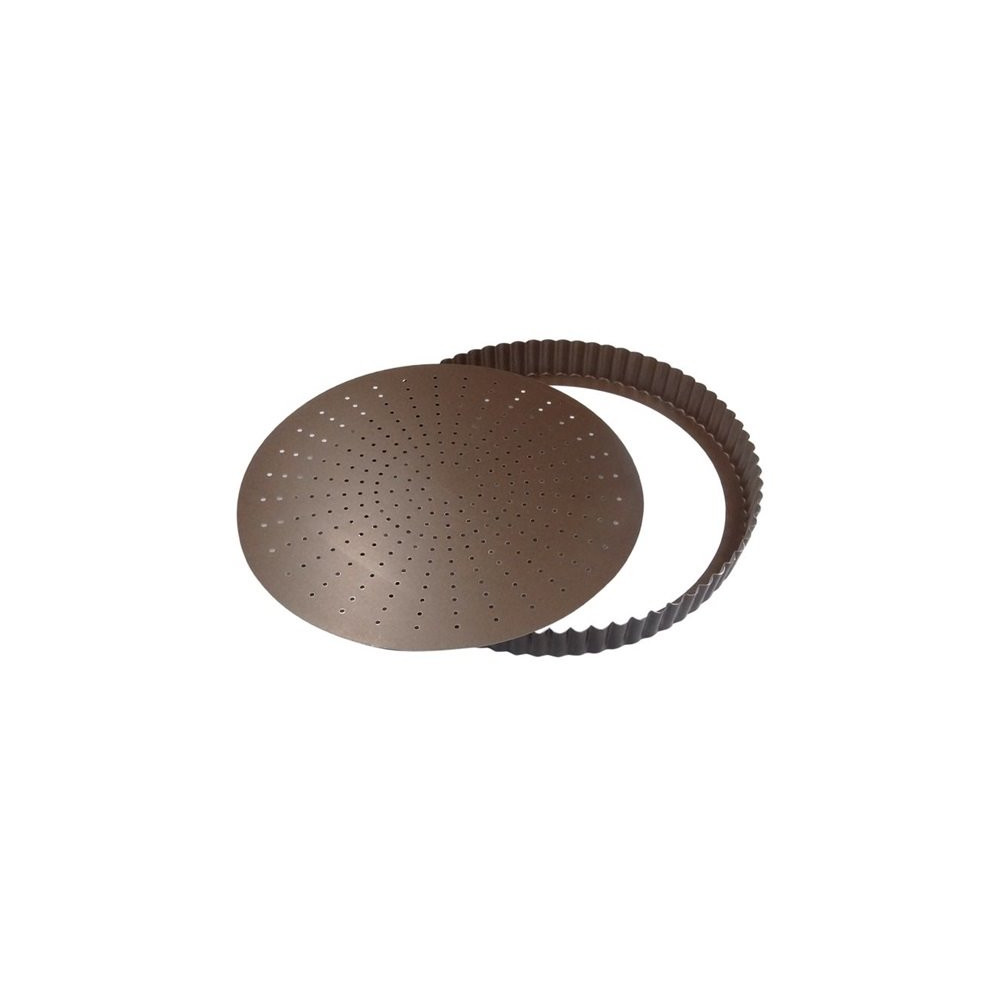 Le fond amovible perforé est la véritable innovation de ce moule : les perforations favorisent une circulation optimale de la chaleur sous la pâte, évitant l'effet « fond détrempé » que l'on redoute avec les pâtes brisées ou feuilletées. Avec un diamètre de 28 cm, ce format généreux est idéal pour les tartes familiales. Le revêtement antiadhérent assure un démoulage facile et une préparation moins grasse, puisque peu ou pas de matière grasse est nécessaire pour garnir le moule. Les bords cannelés apportent une finition esthétique professionnelle à vos préparations.