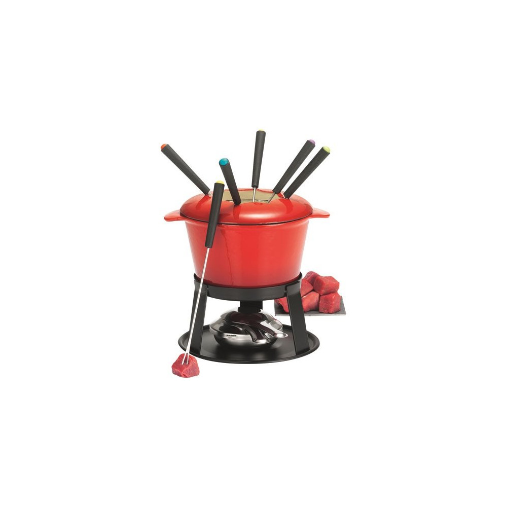 Au cœur de ce service : un poêlon en fonte émaillée, matériau idéal pour la fondue bourguignonne grâce à sa montée en température progressive et sa capacité à maintenir l'huile à une chaleur constante. Le couvercle anti-éclaboussures doté d'encoches accueille et maintient les fourchettes en position pendant la cuisson, évitant ainsi les projections d'huile bouillante — un atout sécurité essentiel.